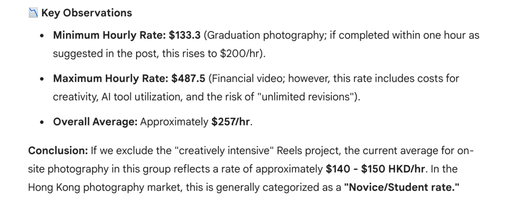 Out of boredom, I used Apify to collect data from a Facebook group designed for hiring freelance photographers. Then I asked Gemini to calculate the average hourly pay of each job. Here is the result: